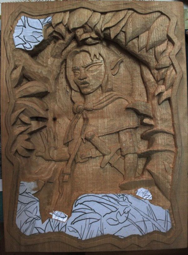 A partir de este momento diversas fases de la talla, en la que voy perfilando cada parte. Si os fijáis veréis que no me ciño completamente al dibujo sino que “interpreto” a lo que me parece quedará mejor.