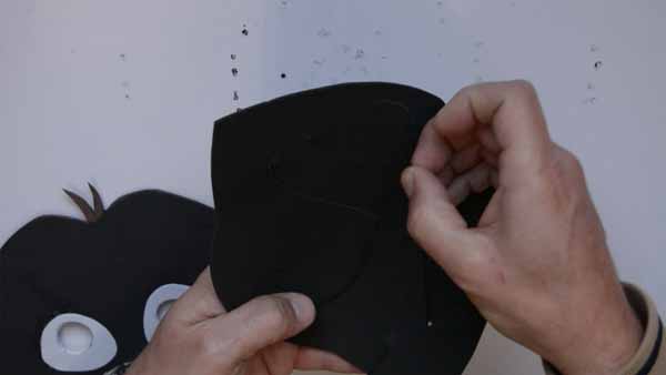Paso 11º: Aplicamos adhesivo a la cara y rellenamos la parte trasera de la nariz y pegamos la cara sobre la pieza de color negro.