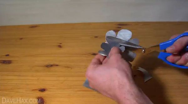 Séptimo paso: Con el trozo de lata que nos ha sobrado, cortamos una segunda pieza para crear el tallo con su típica hoja.